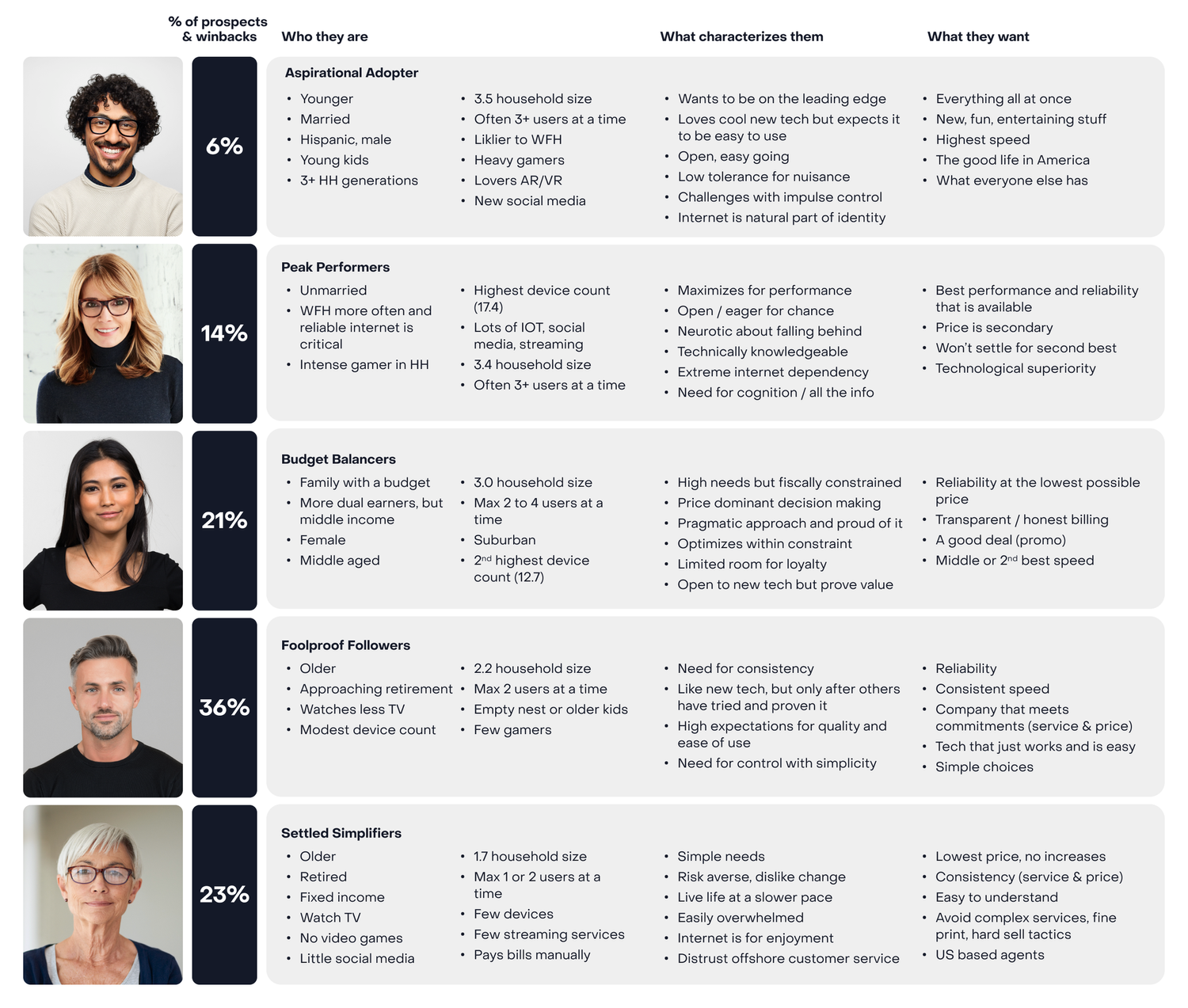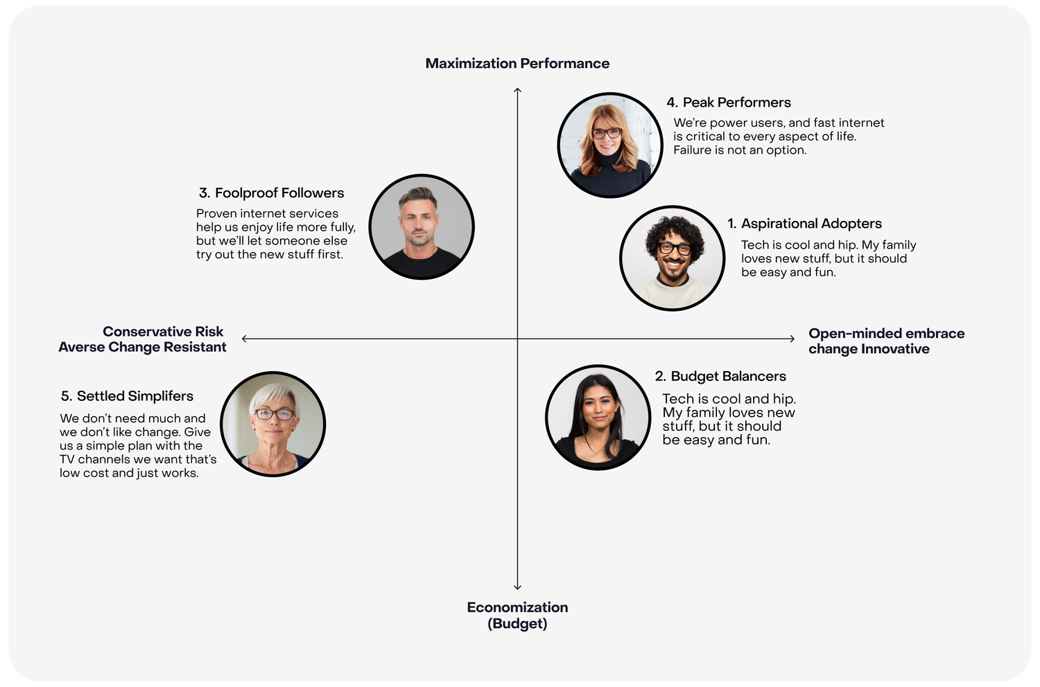 Frontier's marketing department conducted an Online Quantitative survey using a sample of 3,101 people within the Frontier zip-level footprint. Based on four demographics: Tech-savvy mindsets, social media, operational, and product device alignment. They were grouped into five segments.